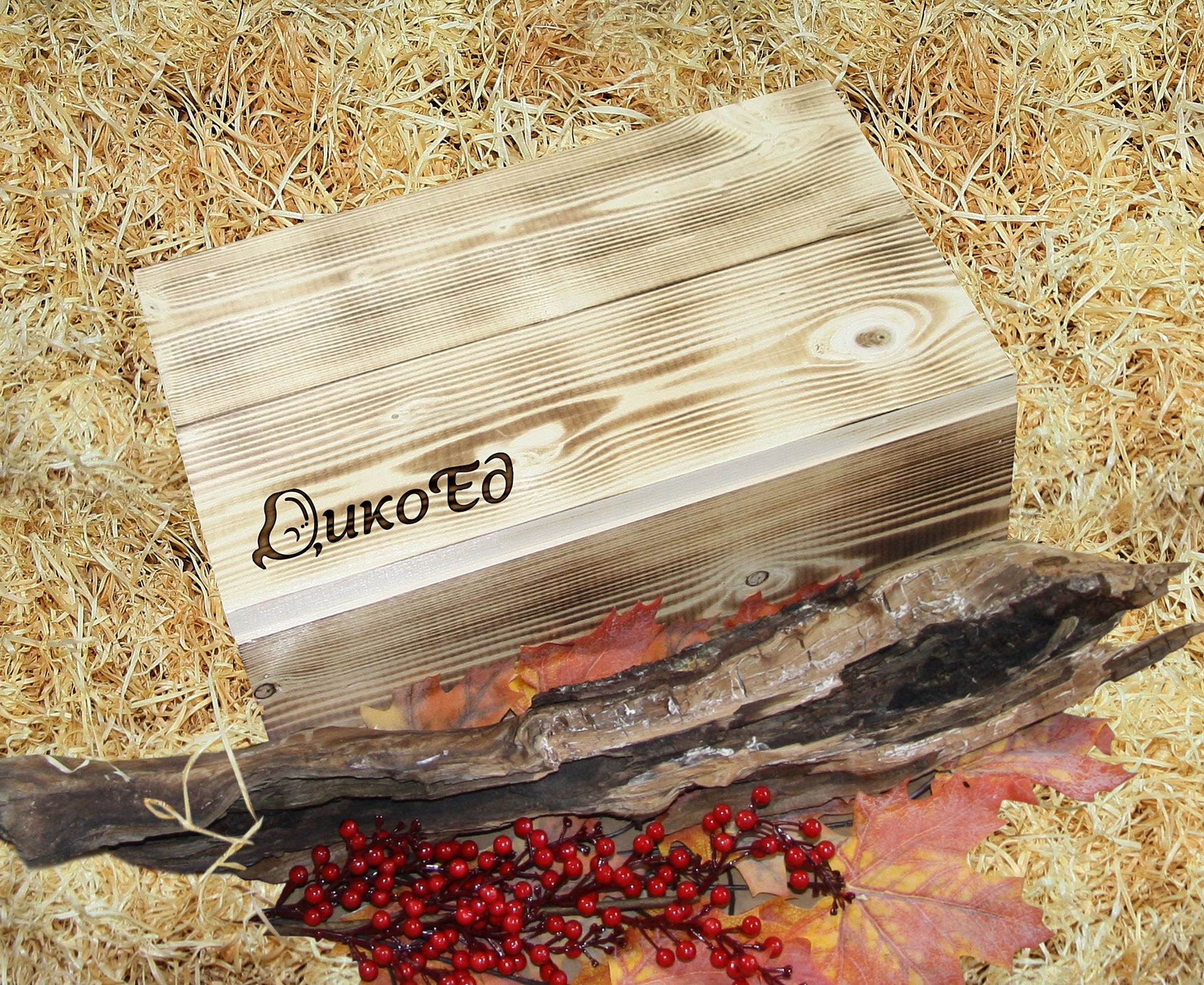 Все это красиво уложено в брутальный хэндмейд ящик из строганных сосновых досок размером 450х300х240мм (размеры в действительности могут не значительно отличаться) с выжженой символикой Дикоеда. Толщина доски 20мм и это делает ящик массивным, жестким, прочным, настоящим. Это не хилая пластиковая упаковка, или китайская коробочка из прессованной бумаги, которая развалится сразу же.